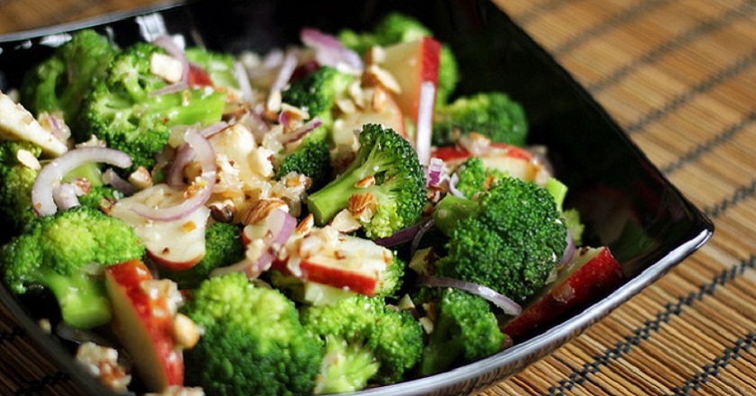 - Залейте брокколи горячей водой примерно на 20 секунд, а после опустите на несколько секунд в ледяную воду, так овощи будут более хрустящими. Смешайте все компоненты салата, заправьте яблочным уксусом и оливковым маслом. Приятного аппетита!