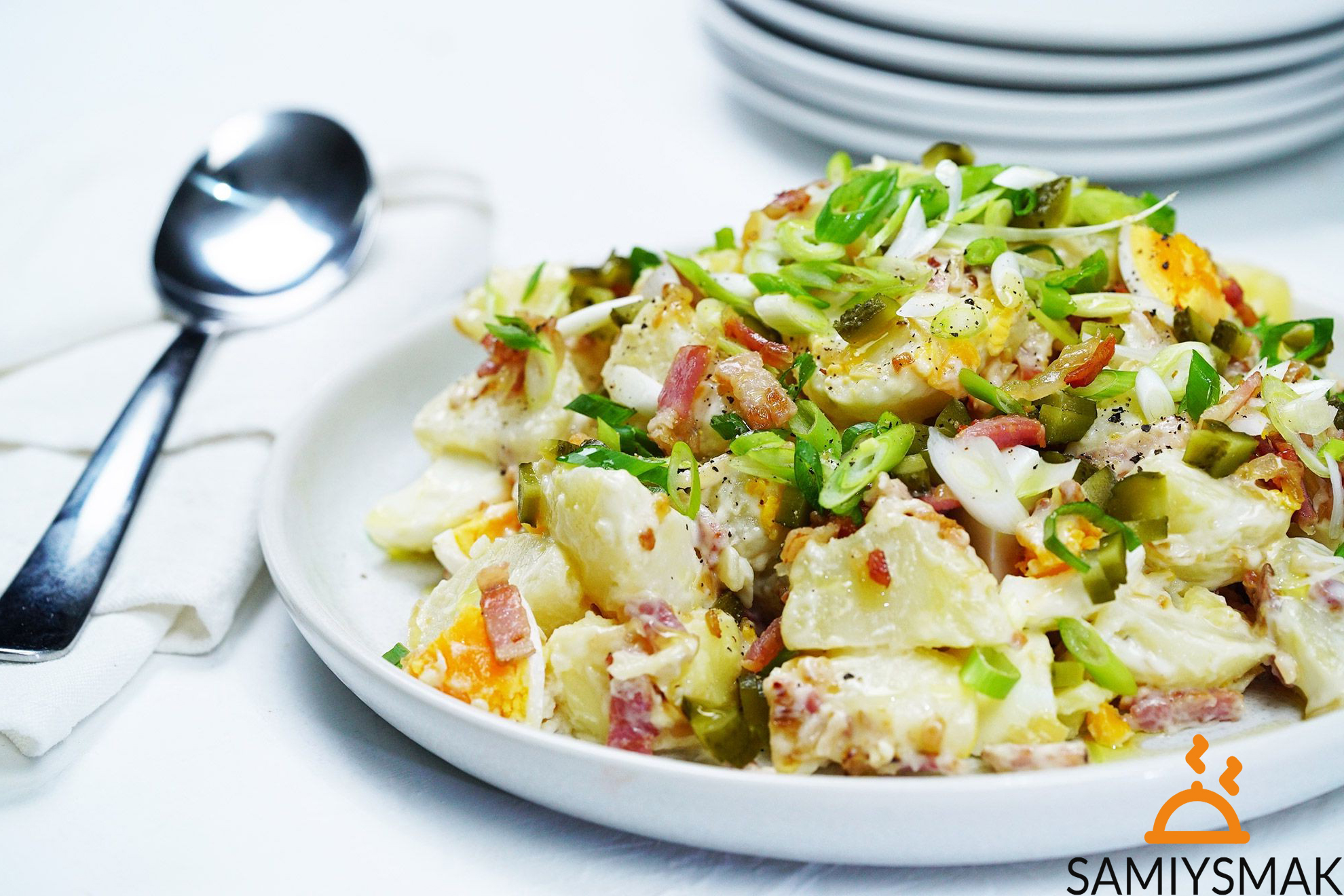 На день рождения летом предлагаем приготовить недорогой салатик. С картофелем получится очень просто и сытно. Если возьмете молодые мелкие клубни картошки, даже не чистите их. Тонкая кожица нежная, в салате совсем незаметна.