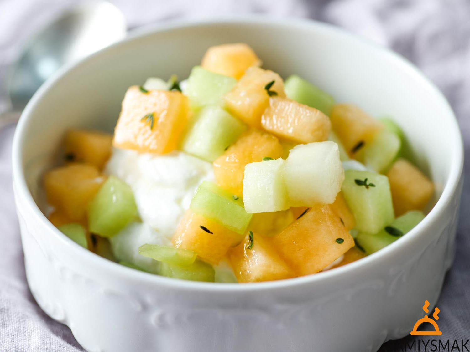 - Мякоть дыни нарежьте ломтиками. Выложите в чашку.