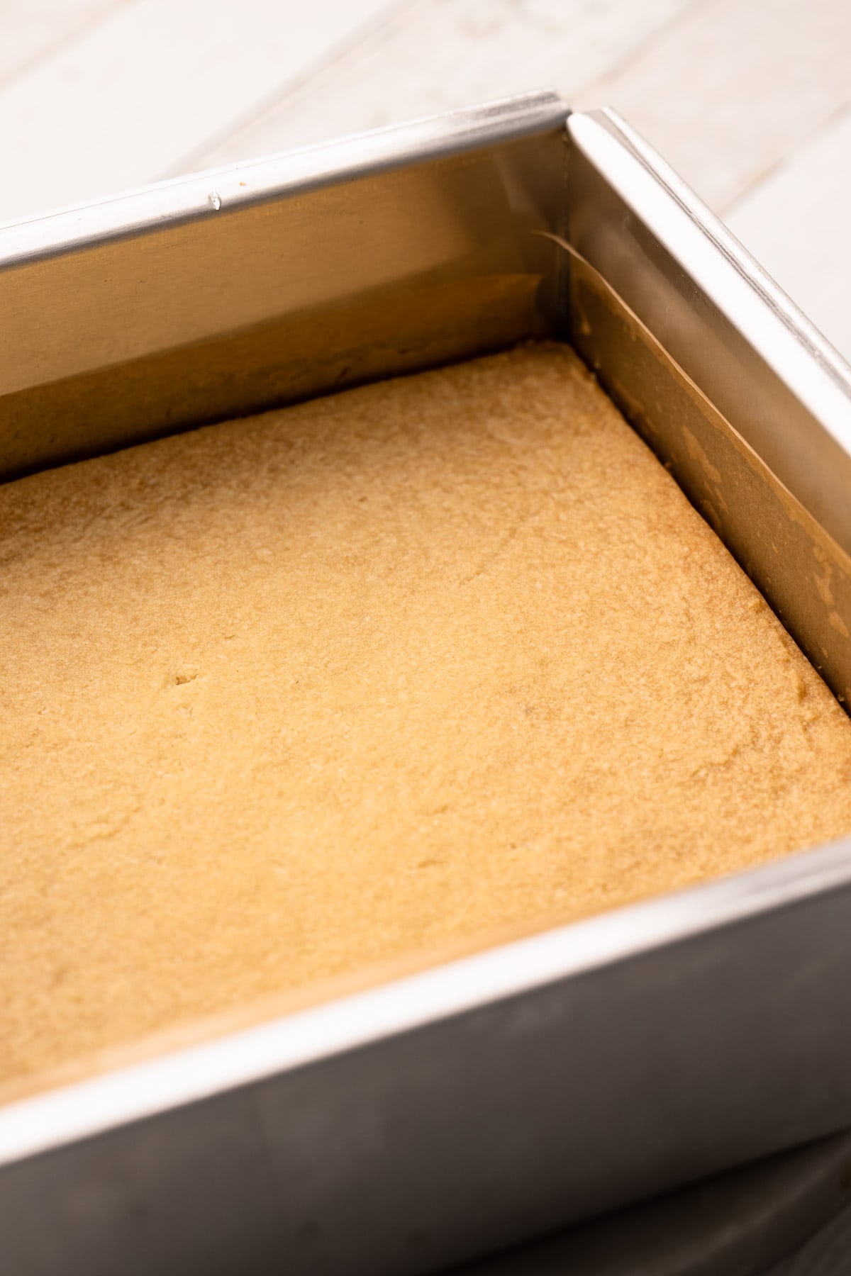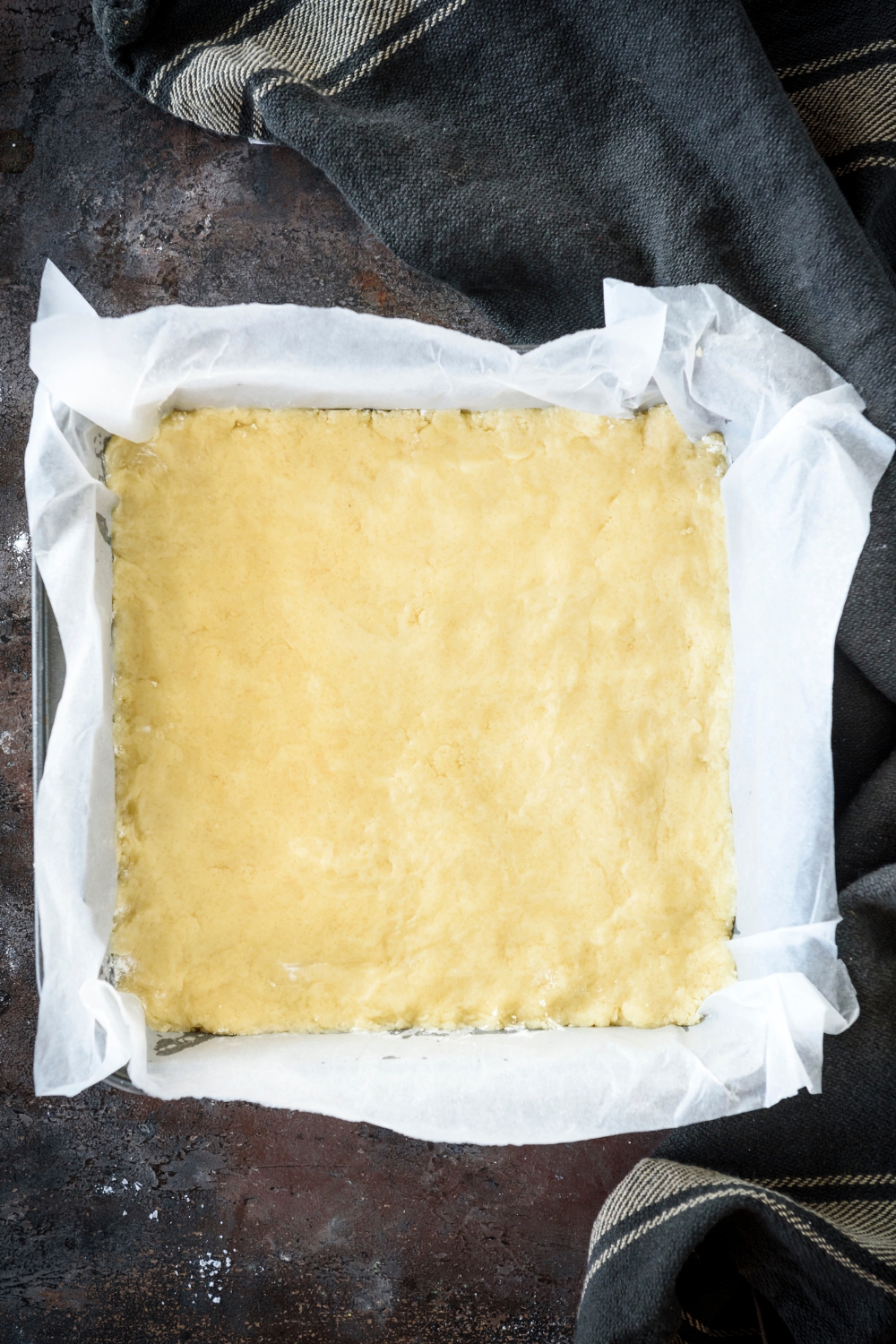 Once the dough is all mixed together, this is where we branch off from the traditional recipe. Instead of scooping out the dough into individual cookies, we will press the Ted Lasso Biscuit dough into an 8×8 or 9×9 greased and lined pan.