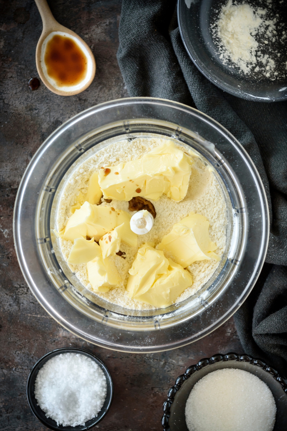 - In your mixer bowl, beat the cold, cubed butter, flour, sugar, vanilla and salt on medium speed until mixture is well-combined and and crumbley– about 1 minutue.