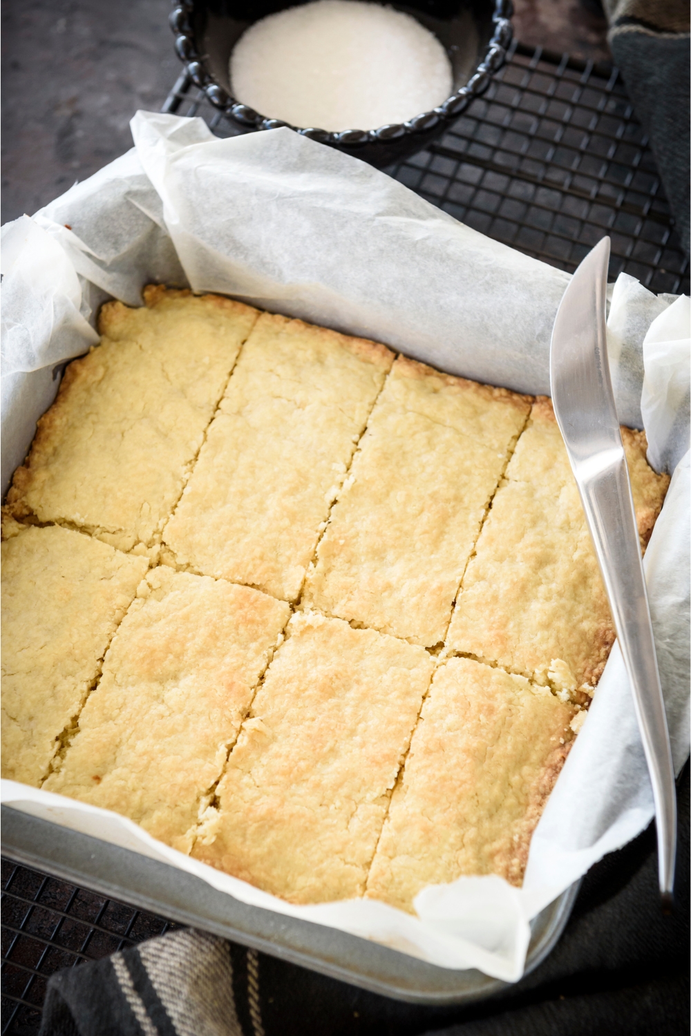 I find baking them for 45 minutes at 325ºF until the edges of the biscuits are golden brown to be ideal. This results in the best biscuit, with slightly creamier biscuits cut from the center, and more traditional drier biscuits towards the edges. If you prefer a more traditional, dried-out shortbread ,then I suggest baking them for another 10 minutes, until the top is very golden.