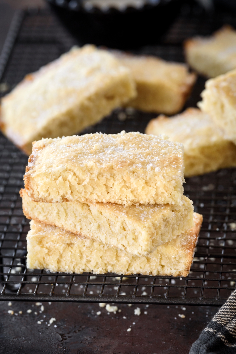 To make the biscuits, you’ll need to combine the ingredients in a food processor, form a dough, press it into a pan, sprinkle with coarse sugar, and bake until golden brown.