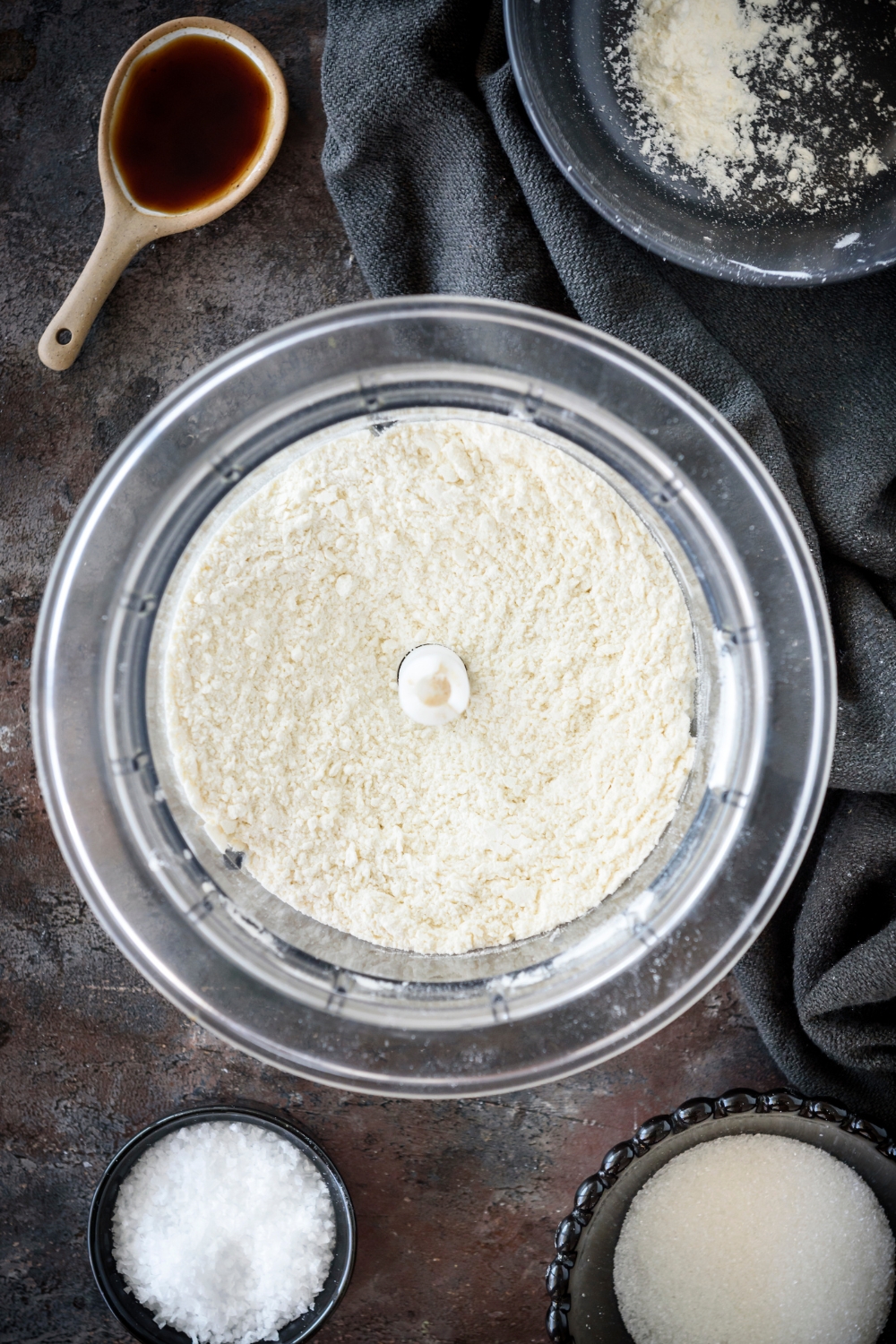 2. Mix the dry ingredients: In the bowl of a food processor, add the all-purpose flour, sugar, and a pinch of sea salt. Pulse to combine.
