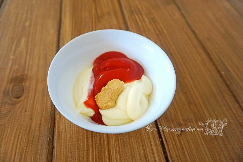 Ингредиенты соуса: майонез, кетчуп, горчицу, паприку и соль по вкусу помещаем в отдельную миску и перемешиваем до однородности.