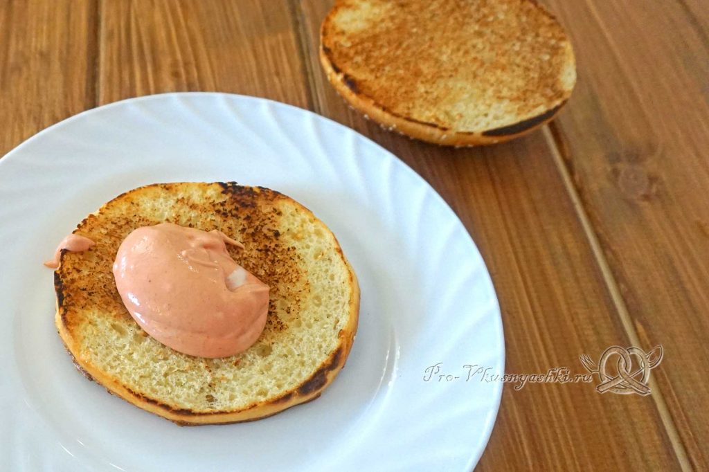 Все ингредиенты подготовлены, начинаем собирать бургер. Нижнюю часть булочки смазываем 1-2 ст.л соуса.