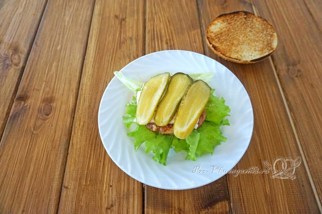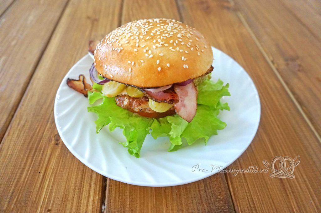 Накрываем наш шедевр верхней частью булочки и наслаждаемся наивкуснейшим, сочным и в тоже время хрустящим домашним бургером с беконом.