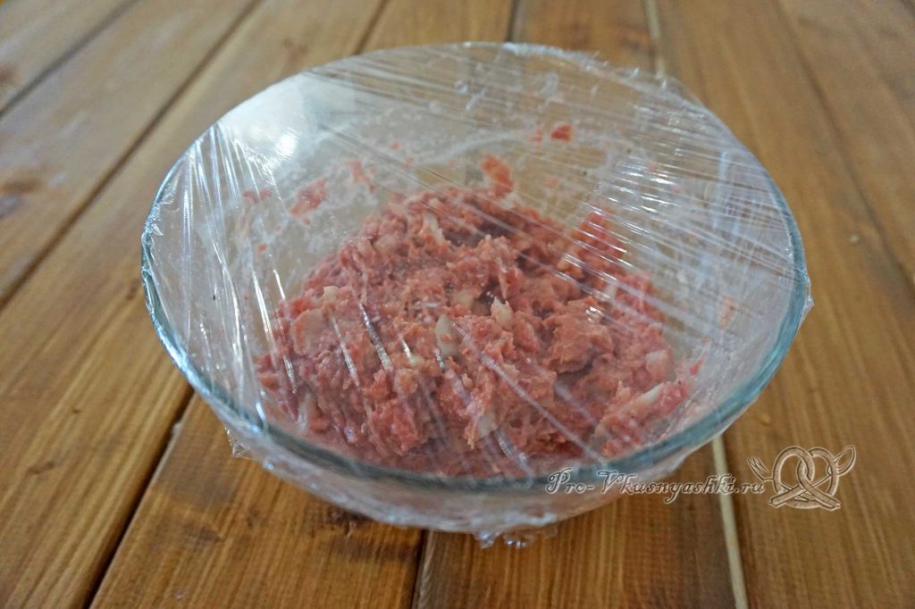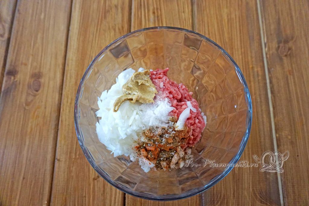 Измельченное мясо, подготовленный овощ, специи, соль и горчицу помещаем в глубокую миску.