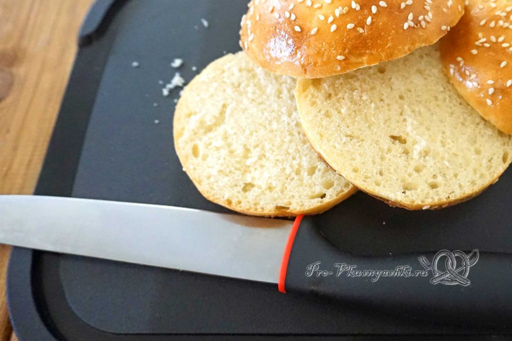 Не теряя времени, займемся остальными продуктами. Булочки нарезаем вдоль пополам.