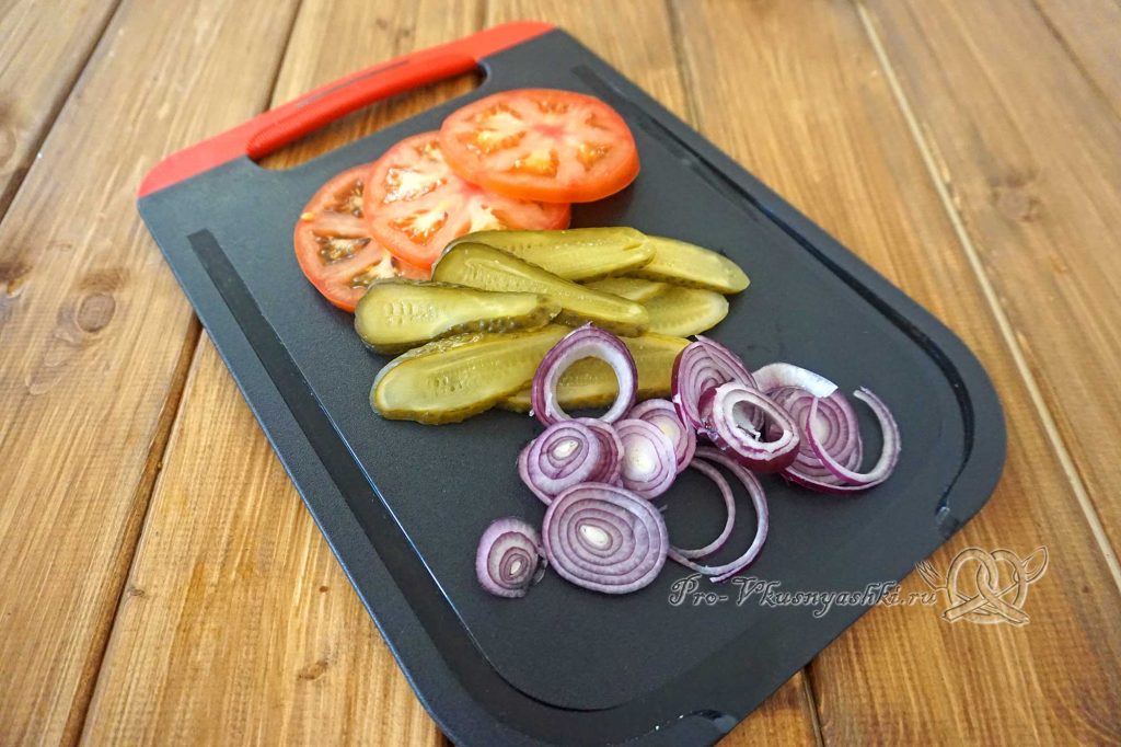 Томаты и маринованные огурцы нарезаем тонкими слайсами, красный лук — кольцами.