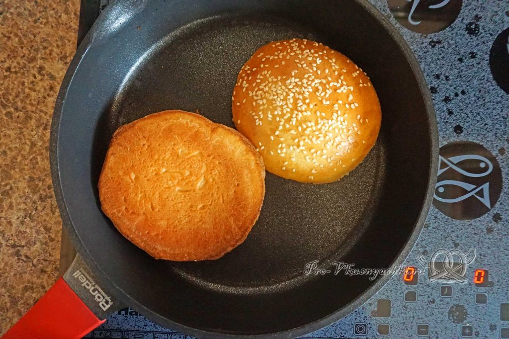 Чтобы наш бургер имел хрустящую основу, обжариваем мучную заготовку со стороны мякиша на раскаленной сухой сковороде около 2 мин до образования золотистой корочки.