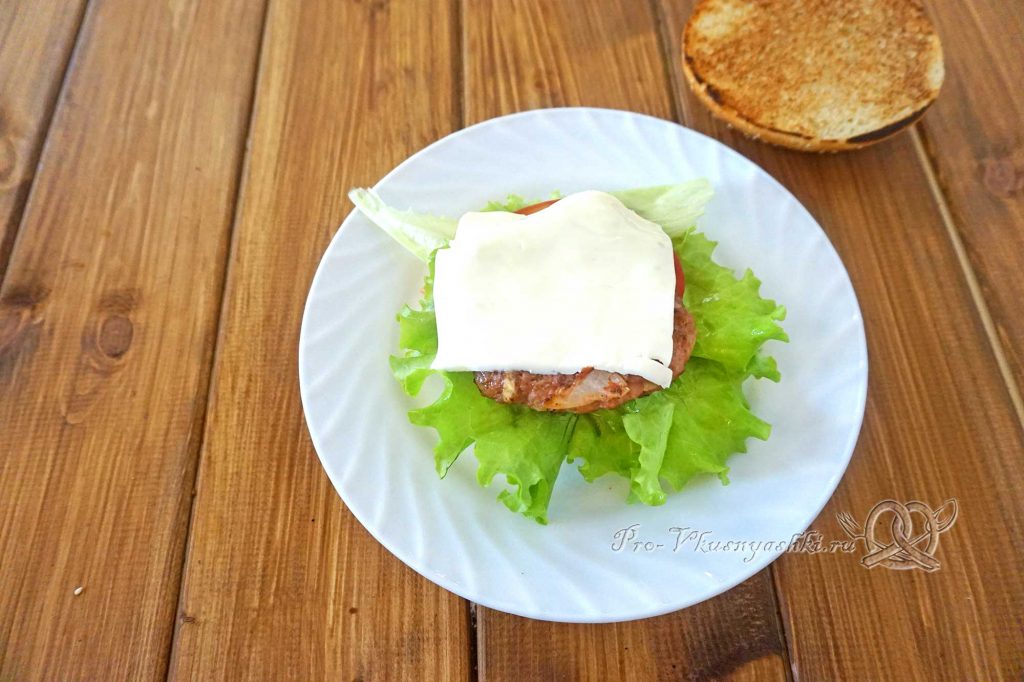 Поверх горячей мясной лепешки выкладываем ломтик сыра.