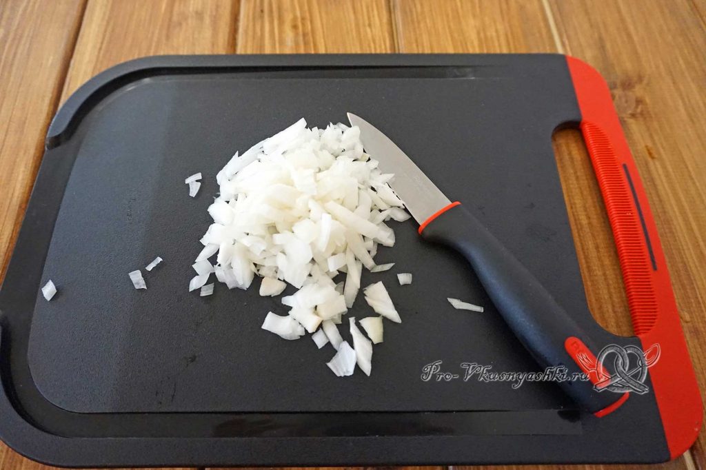Начнем приготовление с фарша для котлет. Белый репчатый лук нарезаем мелким кубиком.