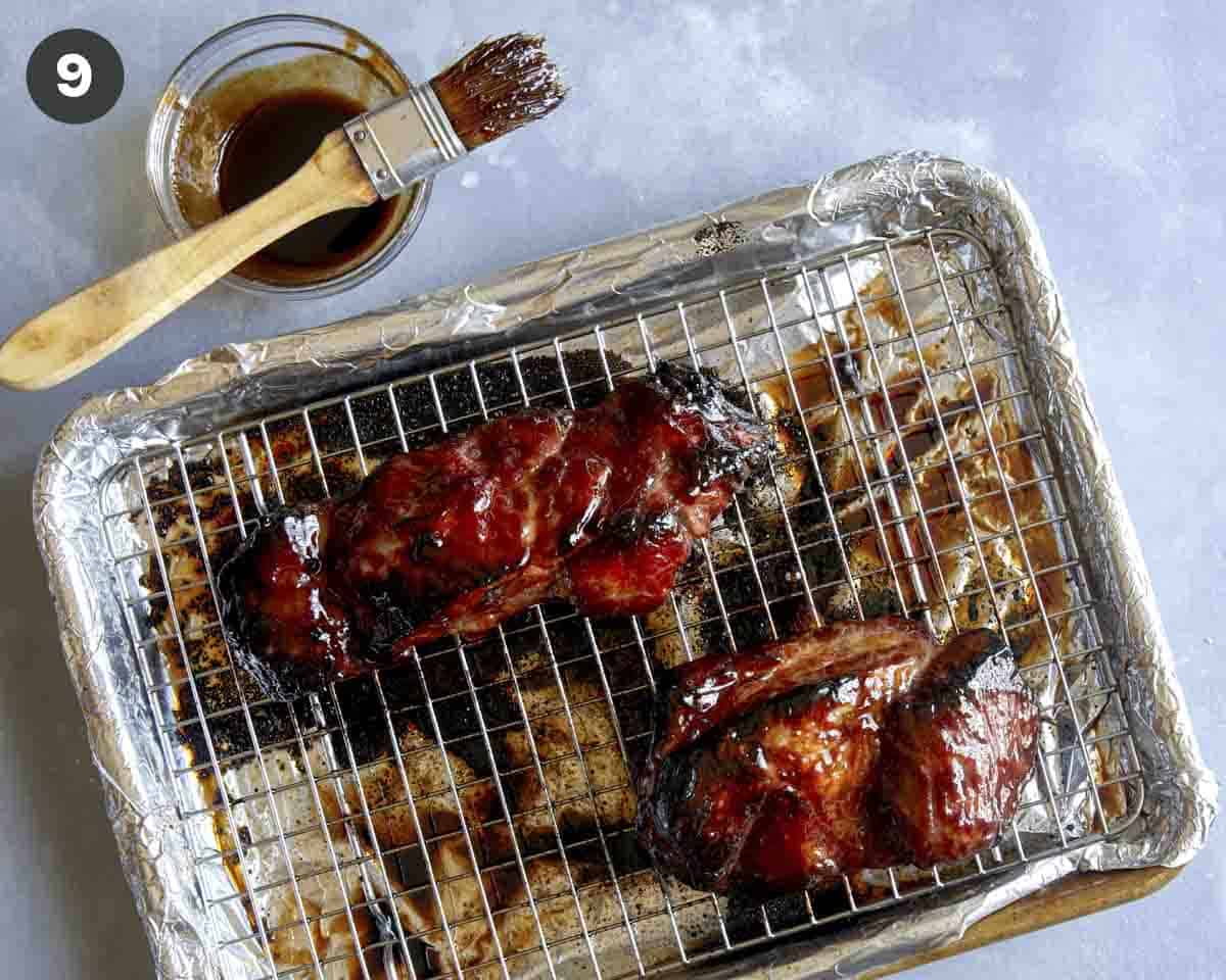 - Line the rimmed baking sheet with aluminum foil, before inserting the wire rack. This will make the cleanup much easier from the marinade/basting liquid that drips from the pork onto the baking sheet.