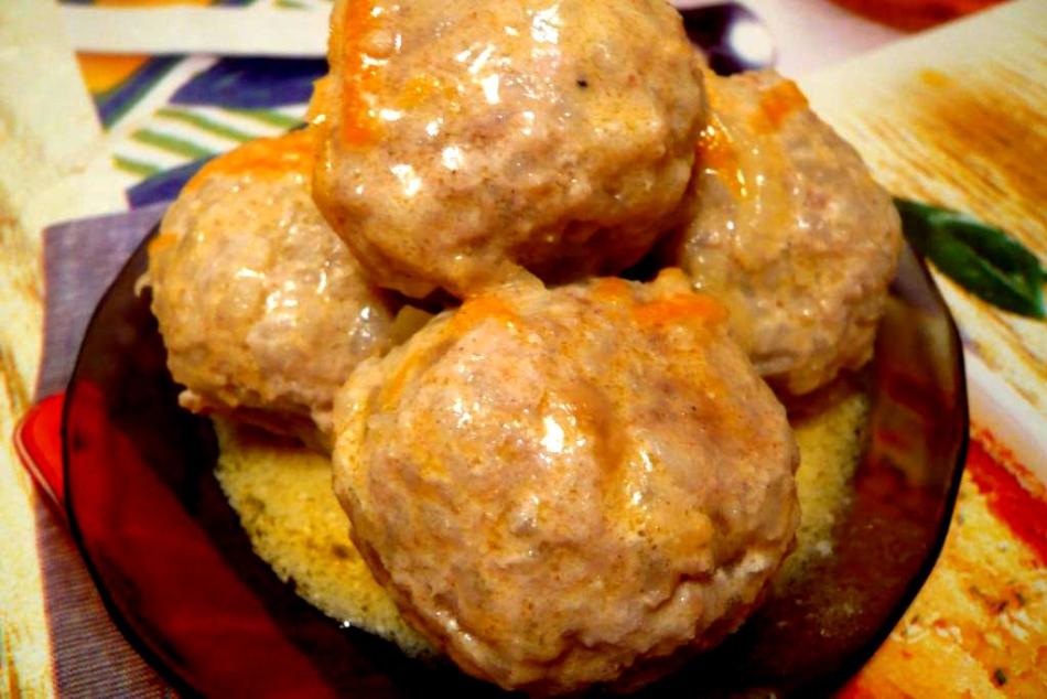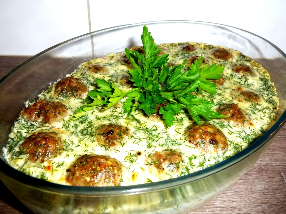 - Сметану разбавляем водой, солим, перчим, заливаем в форме тефтельки, накрываем фольгой, и ставим в духовку тушиться при 180-220ᵒC, близко 40 минут.