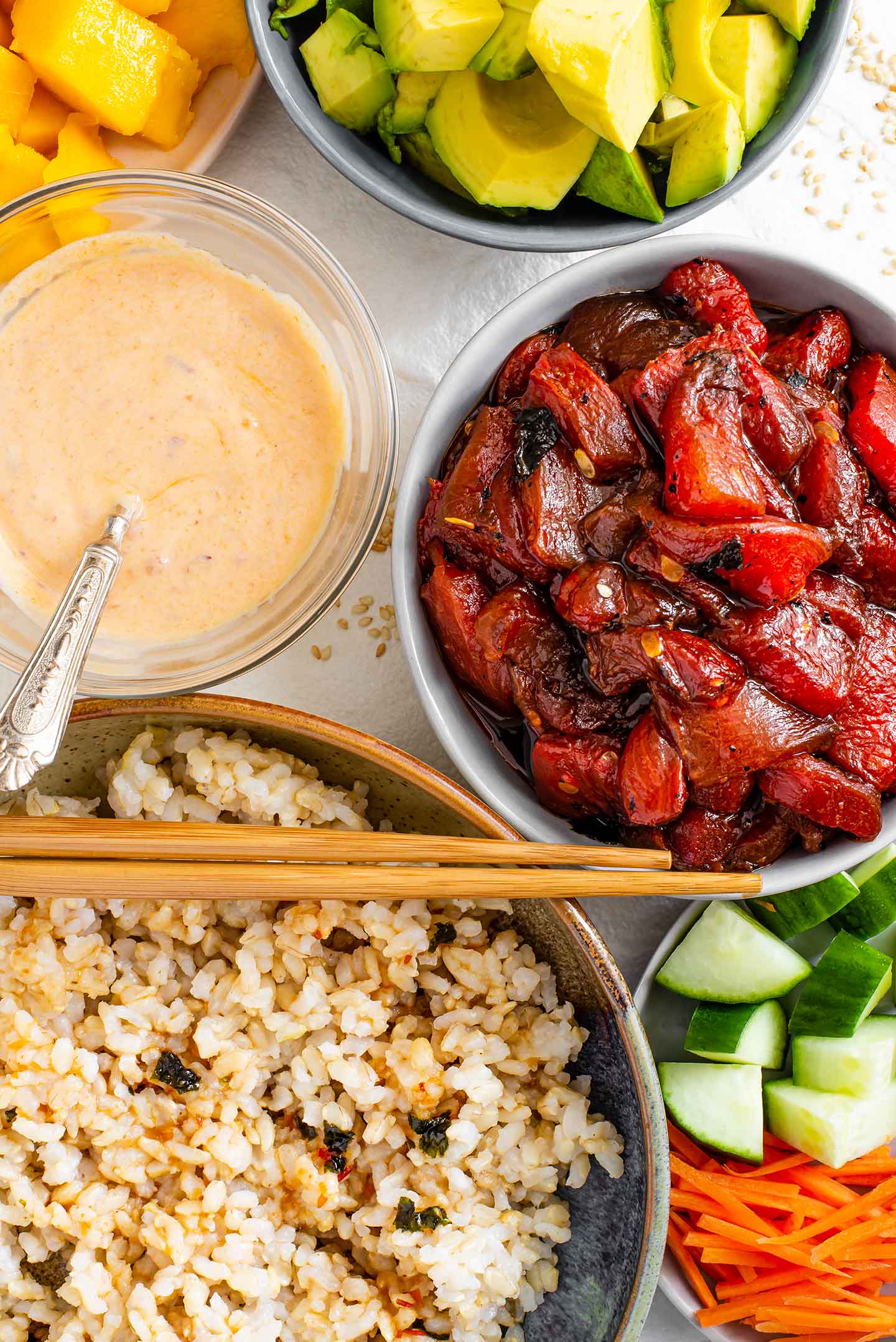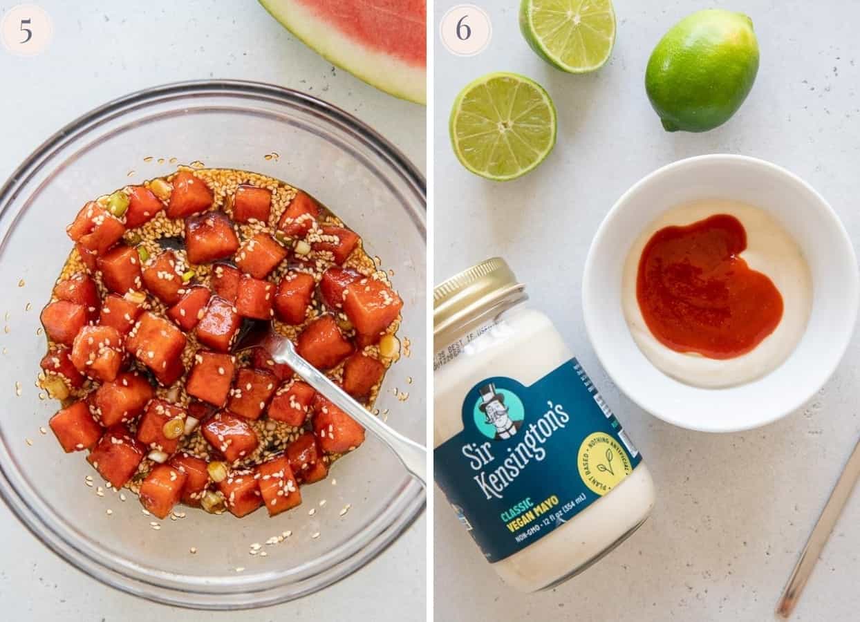 Drizzle cooked and cooled rice generously with marinade, arrange toppings and watermelon «tuna» on top. Drizzle with remaining marinade and Sriracha mayo. Enjoy!