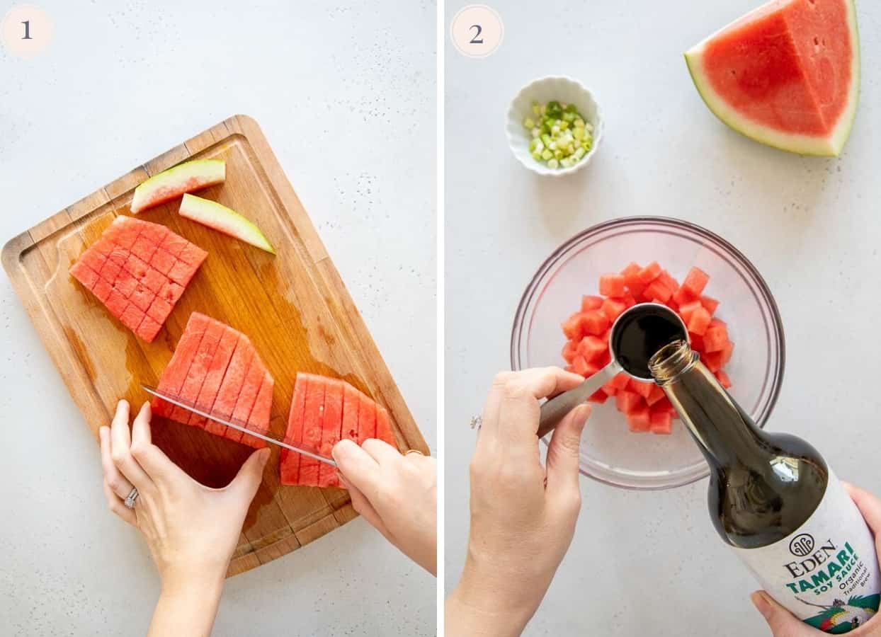 - Mix the marinade ingredients in a bowl large enough to hold your watermelon cubes PLUS some extra room.