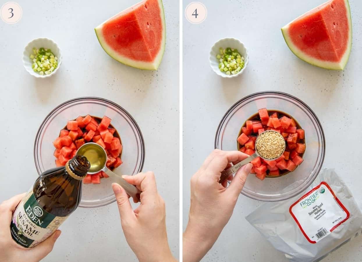Steps 8 & 9 – When the watermelon is done marinating, prep the bowl’s ingredients.