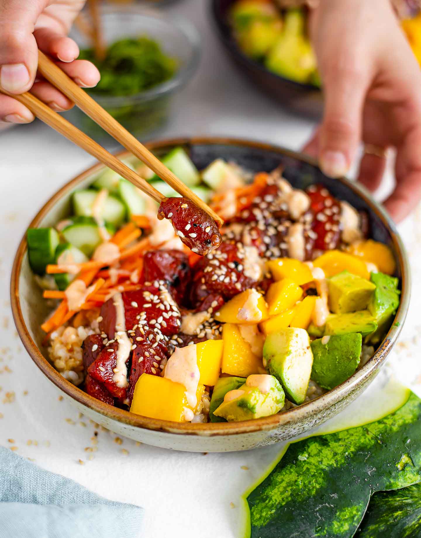 For this vegan poke bowl recipe, I use marinated watermelon to create a colorful, vegan version. This might sound a bit crazy but trust me, it’s delicious!