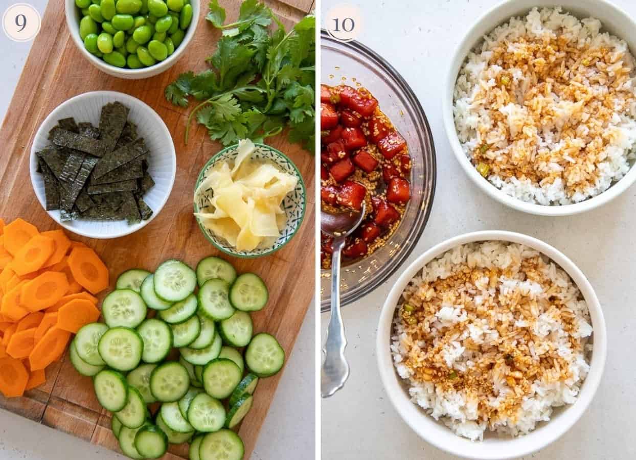 Chop and prep all the other ingredients: edamame, carrots, cucumbers, cilantro, and everything else that’s gonna go in your bowl.
