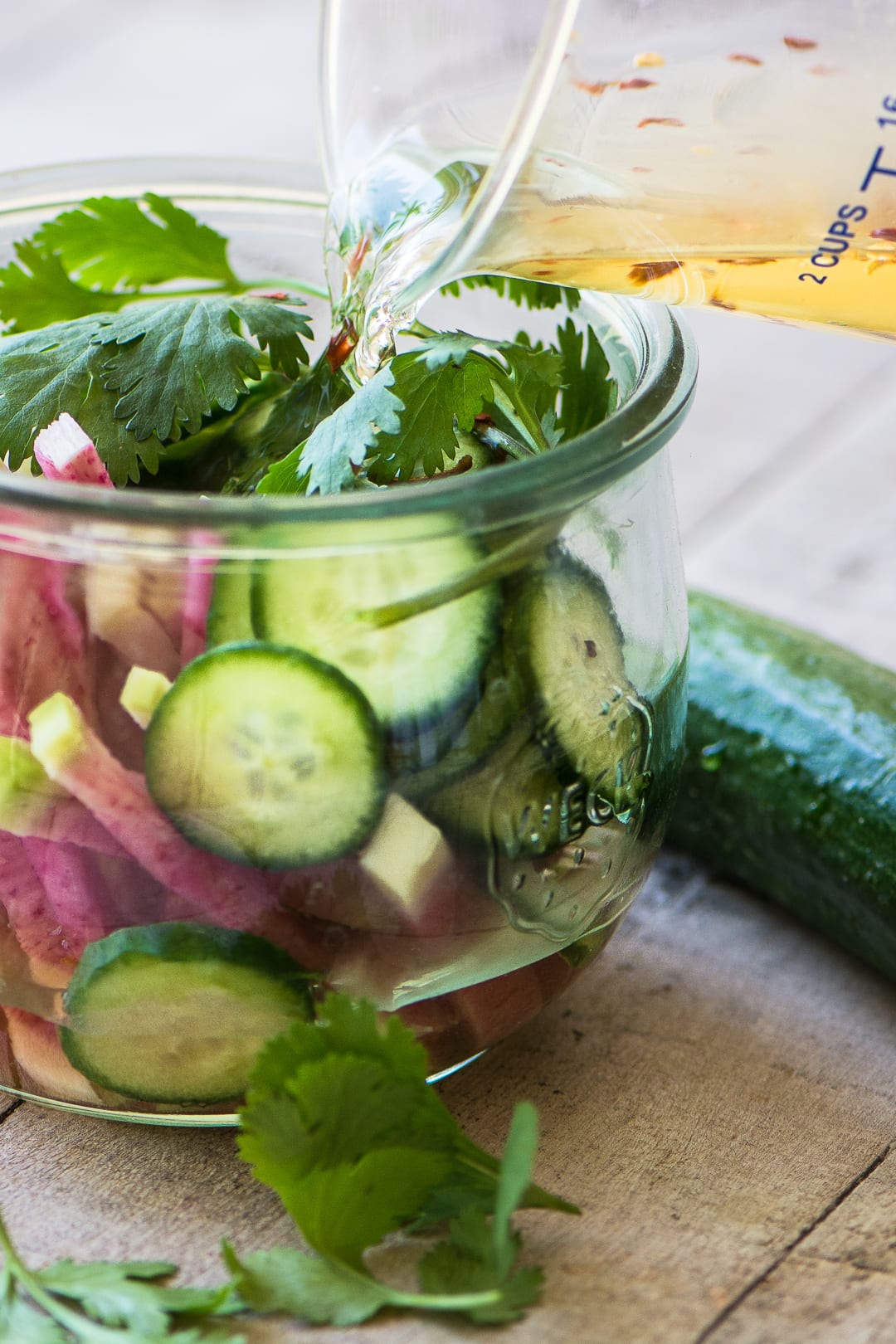 Happily, the pickle is an instant recipe, that is, once you add the pickling brine, the radishes and cucumbers only need an hour to absorb the flavor. They stay super crunchy, too. The brine is a mixture of rice wine vinegar, water, hot pepper flakes, and cilantro. (You can re-use the pickling liquid, too, just keep it in the fridge.)