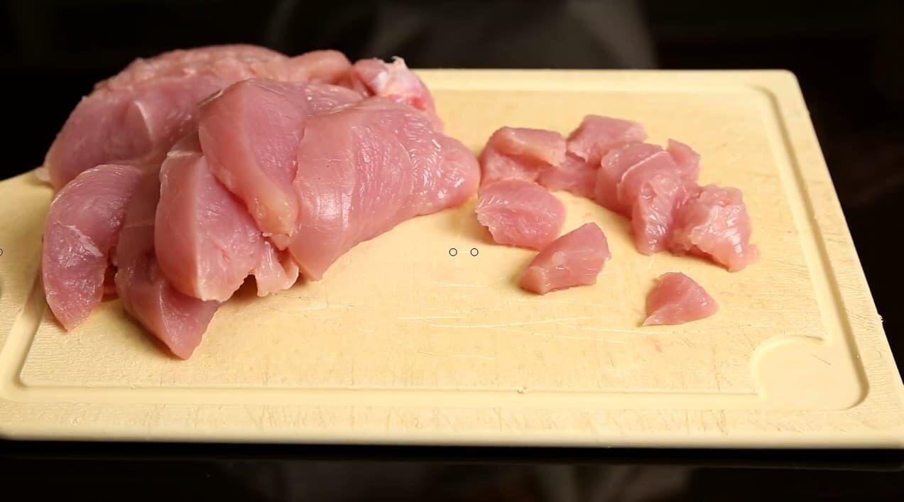 Для начала приготовим все необходимые ингредиенты. Помоем, очистим от жира и кожи филе индейки, порежем на небольшие квадратные кусочки. Далее небольшими кубиками нарезаем лук и морковь.