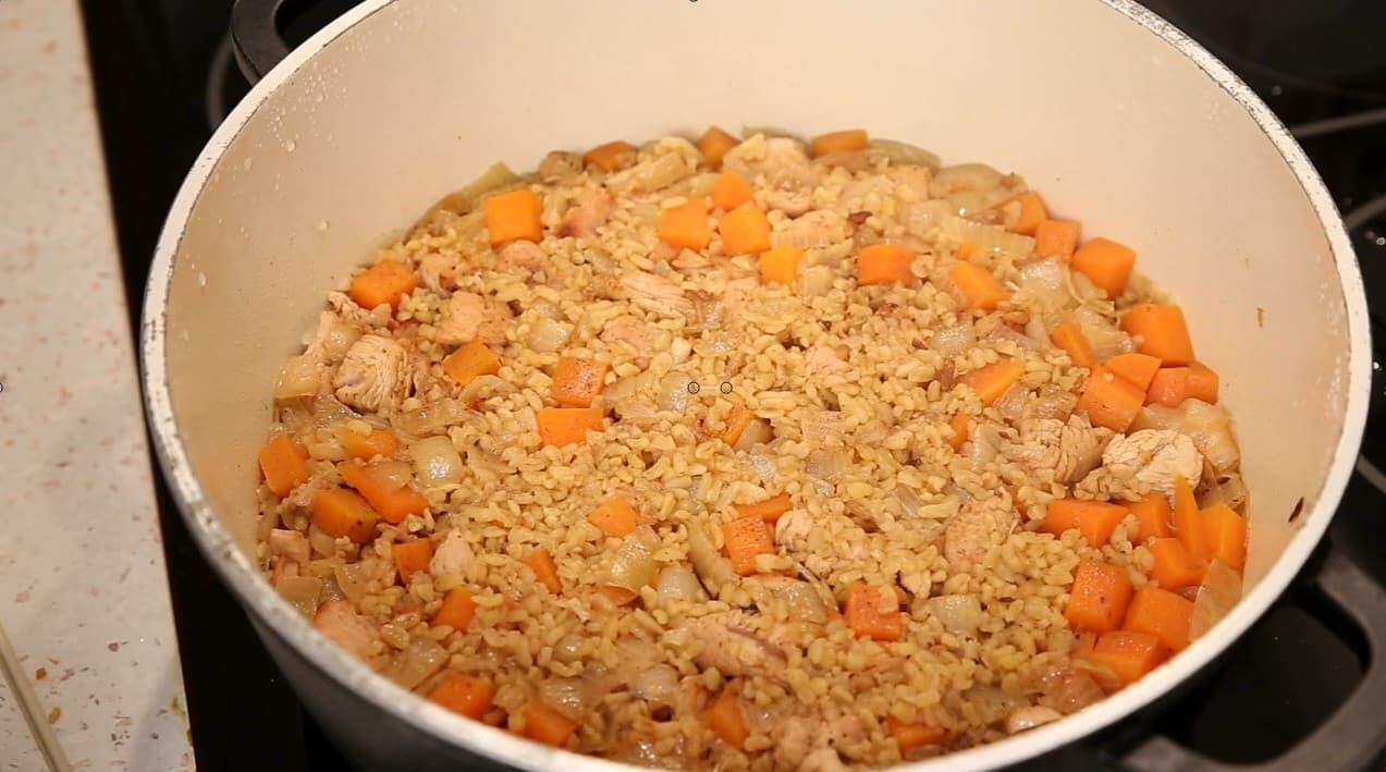 Добавьте куриный бульон и хорошо перемешайте. Доведите до кипения, убавьте огонь, накройте крышкой и тушите, пока рис и курица не будут готовы, а вода почти полностью не высохнет.