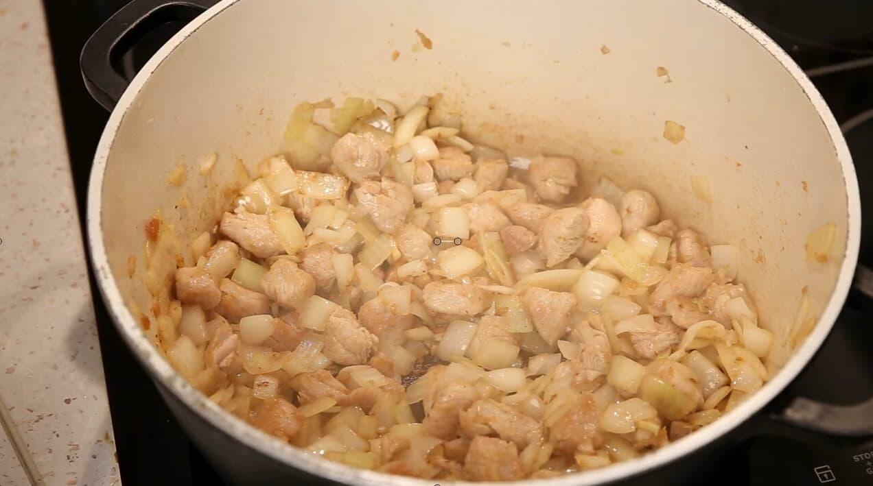 Теперь добавьте маринованные куриные кубики и хорошо подрумяните. Во время подрумянивания часто помешивайте, чтобы не пригорать.