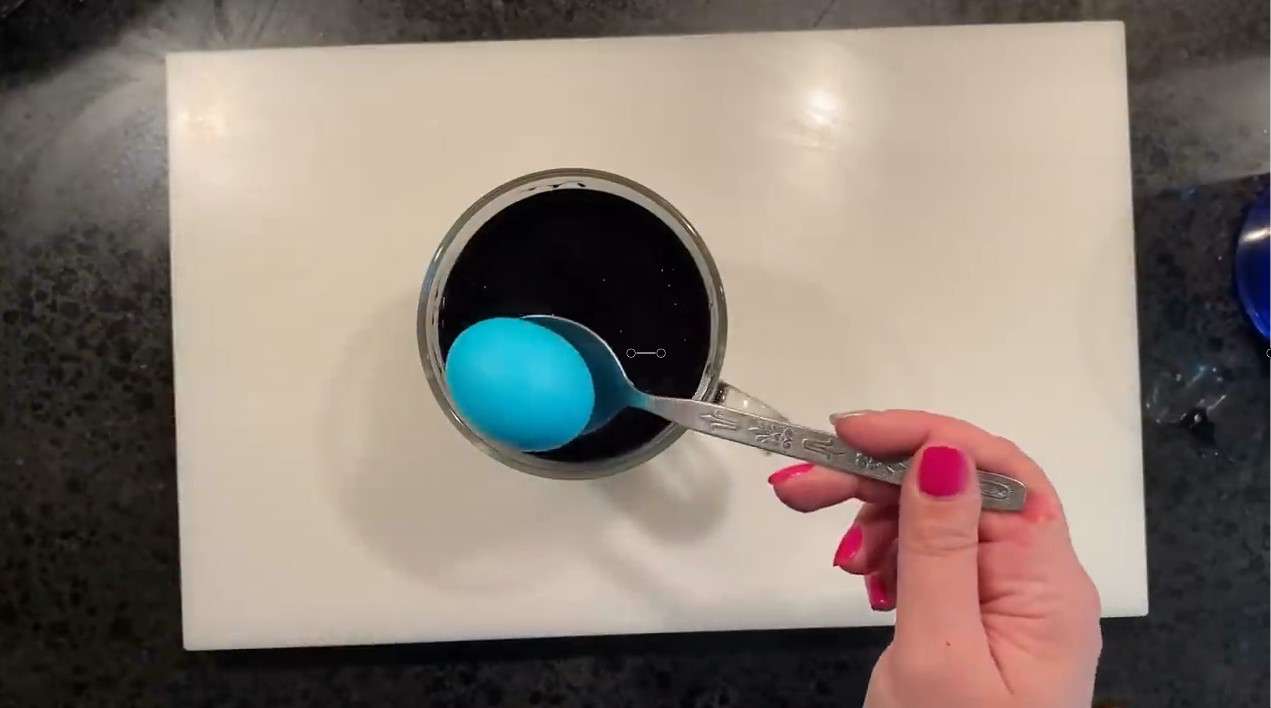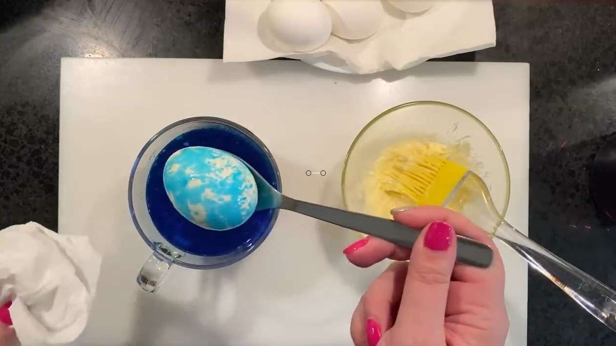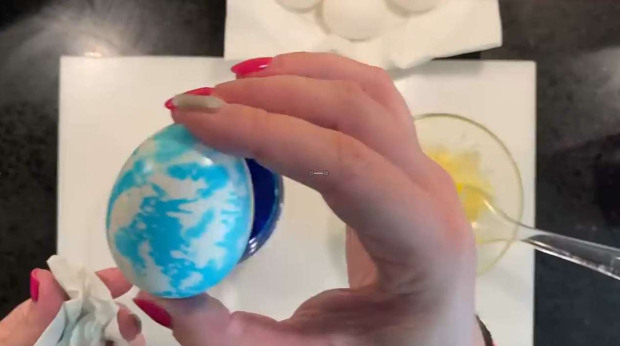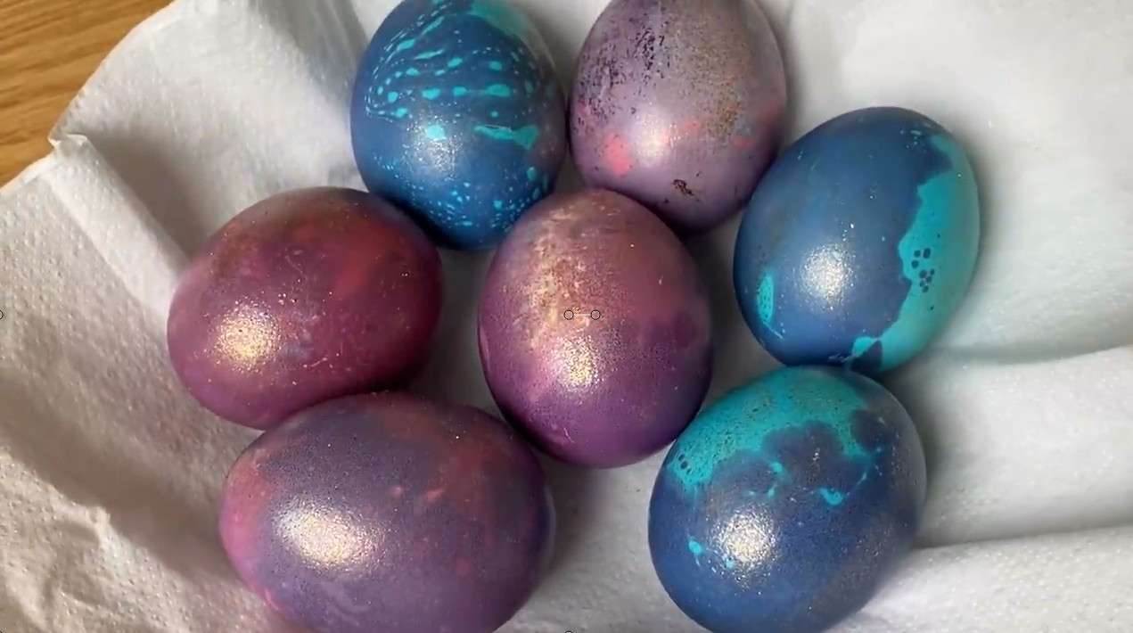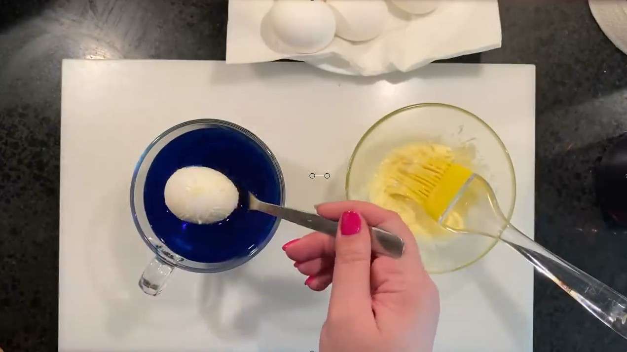 4. Опустить в эту ёмкость предварительно окрашенные яйца на 10-15 сек. Вытащить и высушить салфеткой.
