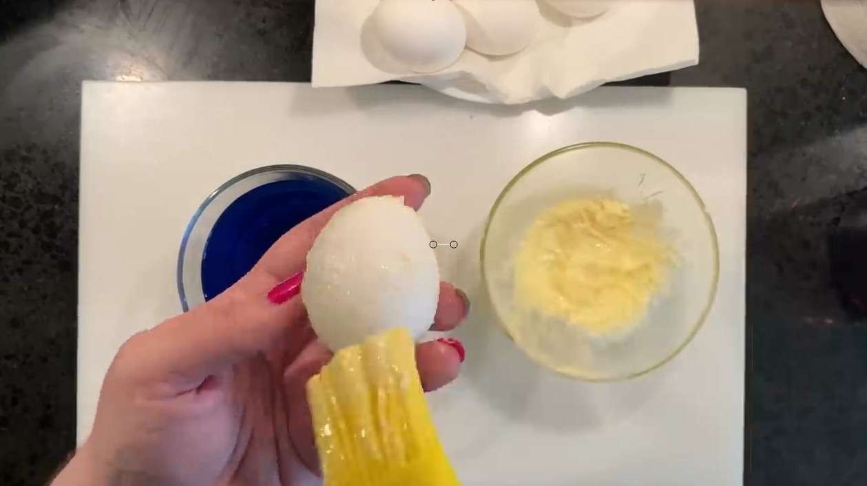 2. Мягкое сливочное масло с помощью кисти нанести на яйцо беспорядочными мазками.