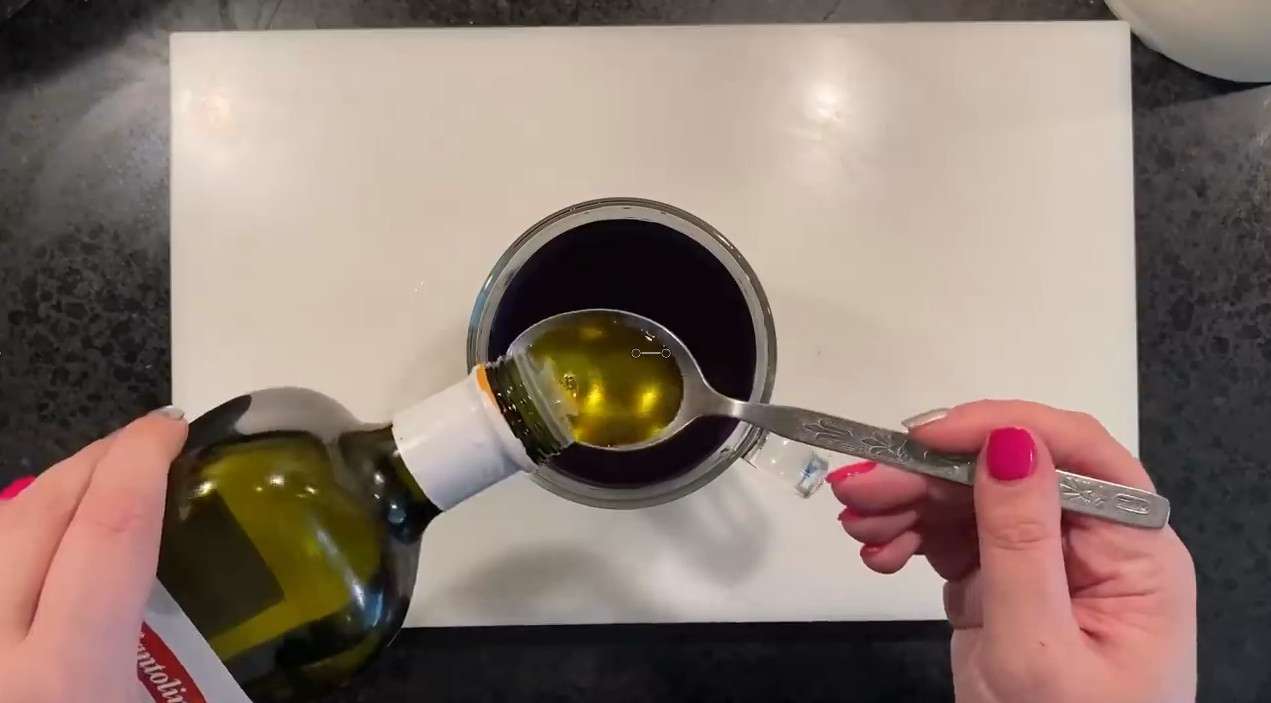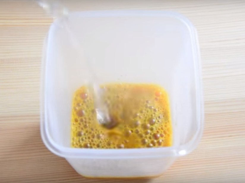 3. В отдельной ёмкости развести краситель более тёмного оттенка. Добавить 1 ст.л. масла растительного и перемешать, чтобы оно образовало мелкие «пятна» на поверхности крашенной воды.