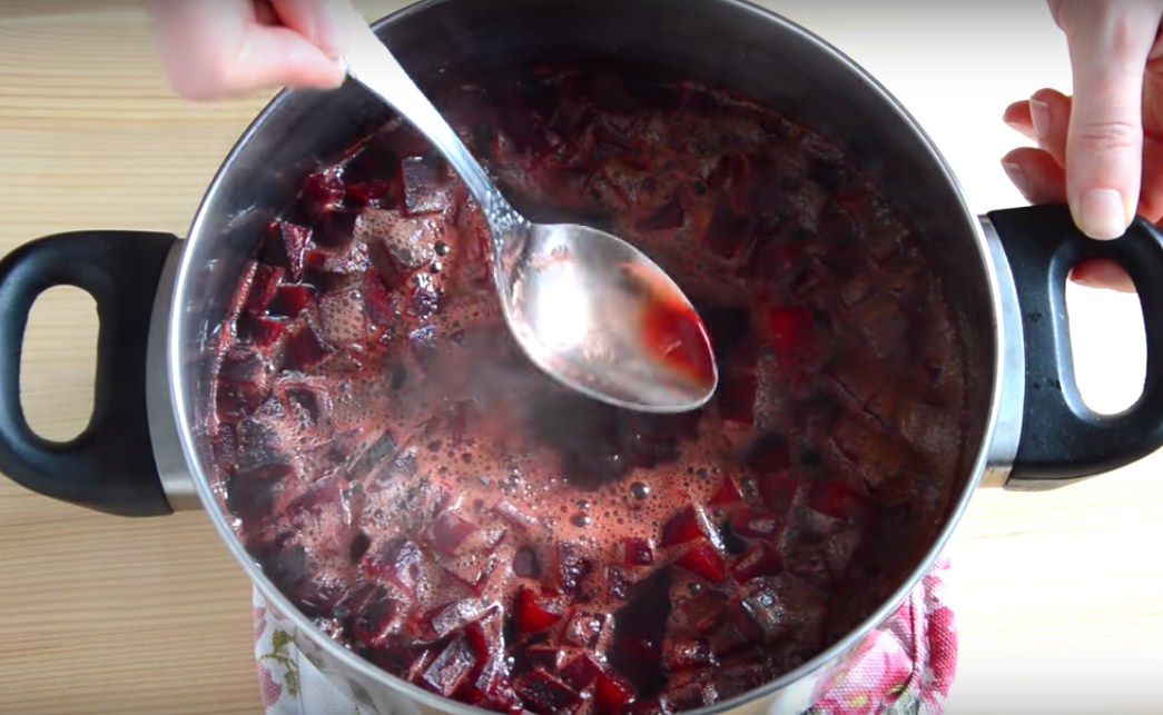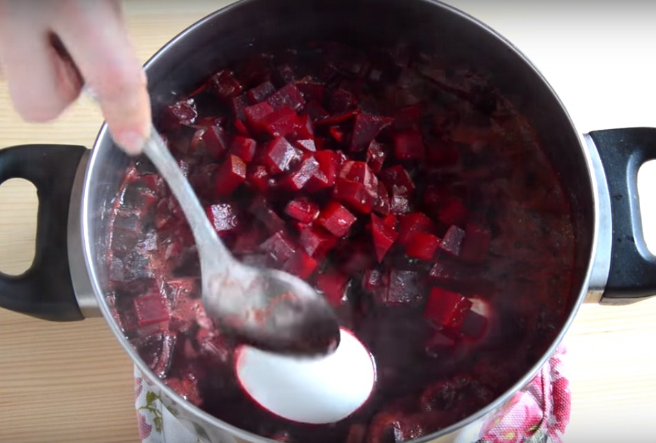 Нарезаем свеклу кубиками. Можно натереть на терке. Отвариваем 10 минут. Жидкость получается ярко-красного цвета.