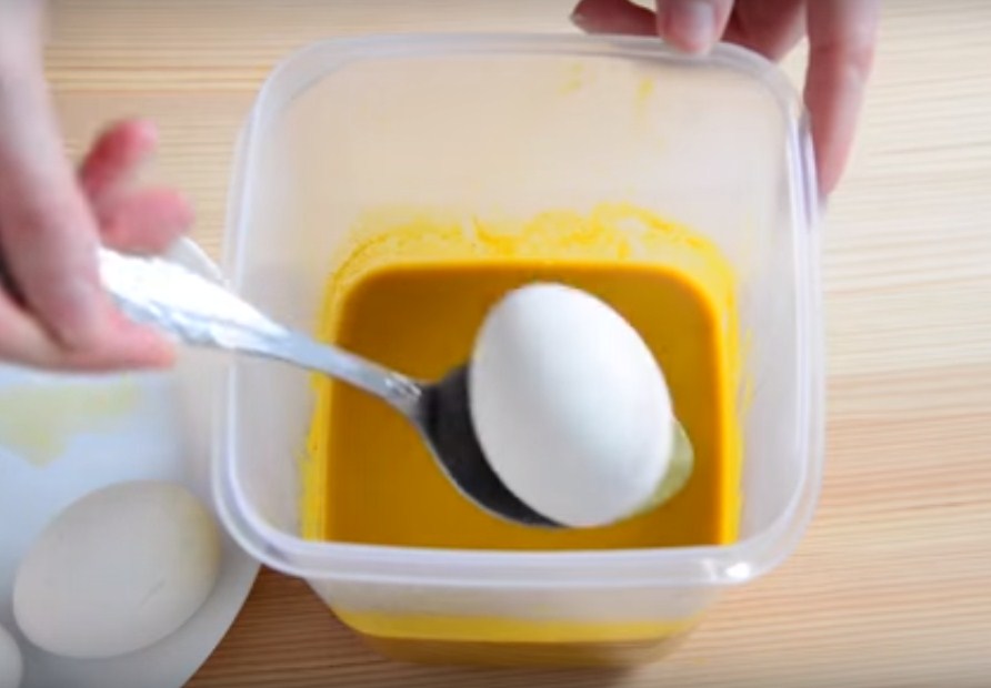 Вареные горячие яйца переложите в миску с шафрановой водой и оставьте так на несколько часов. Кстати, если хочется получить очень насыщенный цвет яиц, можно сделать более концентрированный раствор.