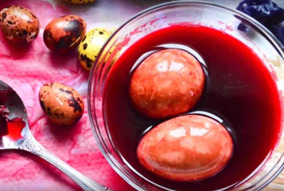 В зависимости от количества ягод и времени выдержки яиц оттенок будет более или менее насыщенным. При помощи соковыжималки необходимо получить достаточное количество натурального сока. Если ее нет, то ягоды можно растолочь и смешать с водой.