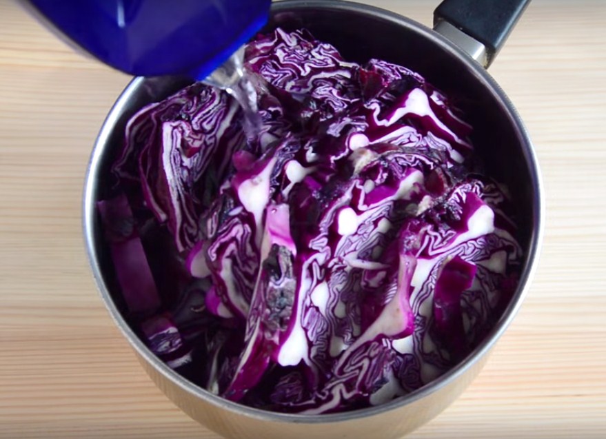 Заливаем капусту водой, варим 10 минут, до мягкости. Вода должна стать насыщенного сине-фиолетового цвета.