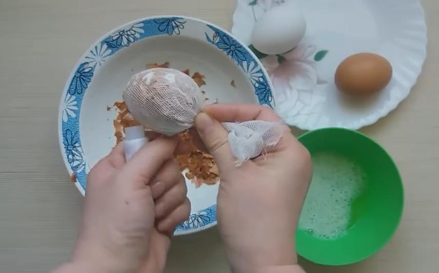 Марлей или бинтом можно заменить капрон при окраске с элементами травы, бумаги и прочего. А также можно использовать марлю автономно. Обмотайте яйцо на 2–3 раза, завяжите марлю ниткой, лишнее обрежьте. Время варки 5-8 минут. После того как они остынут, снимите повязку. На яичной скорлупе получится узор в виде паутинки.