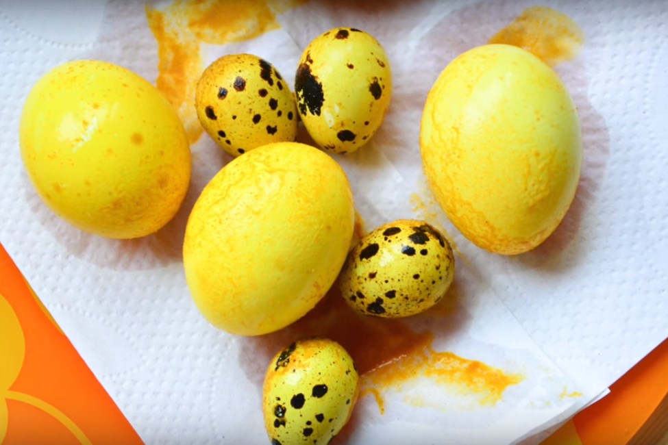 Окрашенные яйца аккуратно вытрите салфетками, так как слой красителя можно повредить – это достаточно легко сделать.