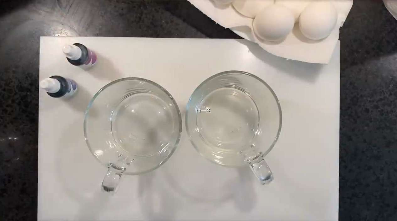 1. В каждую кружку налить теплую воду и добавить 5-6 капель красителя и хорошо перемешать. 1 ст.л. уксуса добавить сюда же.