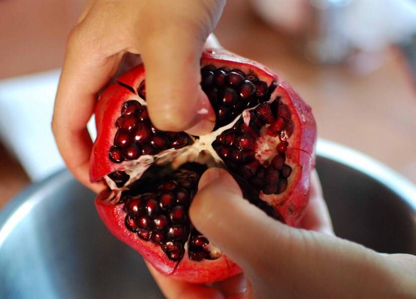 - Делим на части и отделяем зерна от белой мягкой оболочки (рекомендуем для этого постучать ложкой по кожуре, поднеся кусок к заготовленной миске) – в процессе в миску начнут падать зернышки;