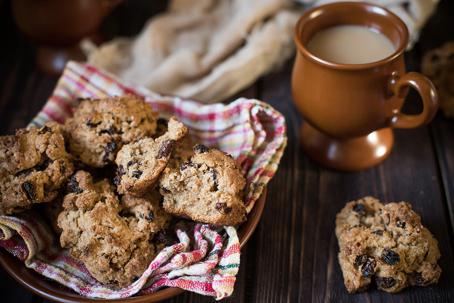 Муку перед добавлением в тесто обязательно нужно просеивать, а потом ее смешивают с солью, разрыхлителем (содой) и дополнительными ароматизаторами (например, ванилином). Часть муки можно заменить овсяными хлопьями (цельные или перемолотые в муку). Это сделает выпечку более мягкой, а не хрустящей.