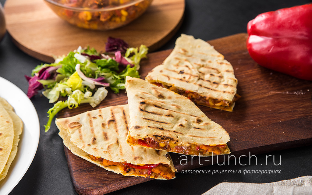 - На лепешку выложите остывшую начинку, посыпьте натертым сыром, накройте второй лепешкой и обжарьте на раскаленной сковороде по 2 минуты с каждой стороны. Затем переложите на противень и уберите на 5 минут в разогретую до 200°С духовку. Подавайте кесадилью, нарезав порционно, с любимыми соусами.