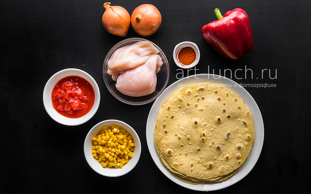 Тебе понадобится:4 тортильи, 220 г курицы, половина луковицы, по половине банки консервированной фасоли и кукурузы, 1 чили, специи, 100 г сыра, 1 ст.л. томатной пасты.Приготовление: