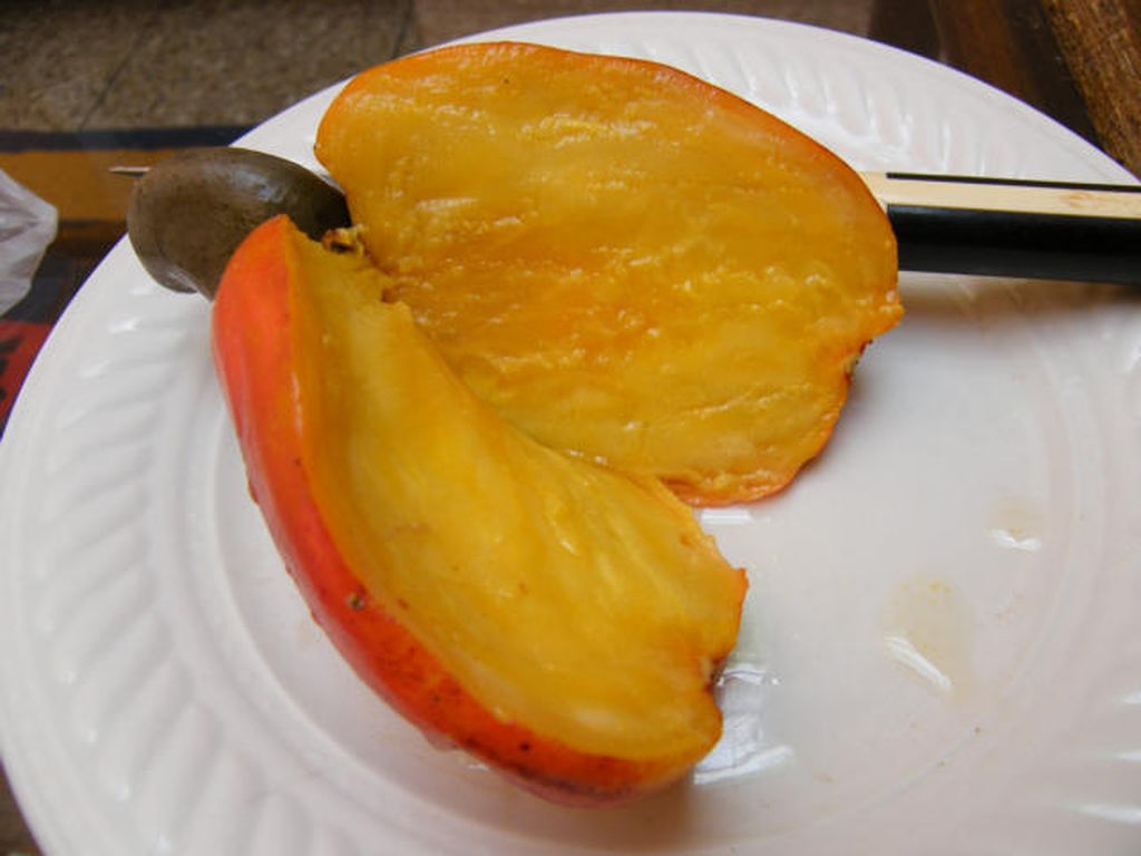 Плоды имеют очень оригинальный вид: сверху яркая красно-жёлтая разросшаяся плодоножка в форме абажура, напоминающая всем известный сладкий перец, а нижняя часть – это изогнутая серо-зелёная костянка с семенем. Верхняя часть именуется яблоком акажу и тоже съедобна, она имеет сладко-острый вкус и тонкую кожуру, но употреблять эти яблоки надо сразу после созревания и опадания, чтобы они не успели испортиться, поэтому на экспорт в свежем виде их не поставляют никогда.