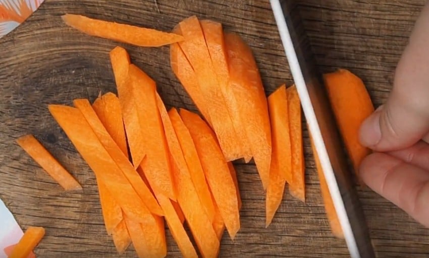 3. Порубите морковь соломкой, лук — полукольцами, а перец — брусочками. Мелко нашинкуйте зелень.