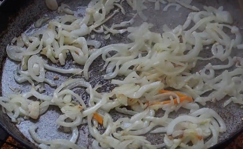 3. Прогрев в толстостенной сковороде масло опускаем в него лук. Обжарив до золотистости, добавляем морковку, готовим её вместе с луком до размягчения, после чего кладём перец. Прожариваем овощи ещё пару минут.