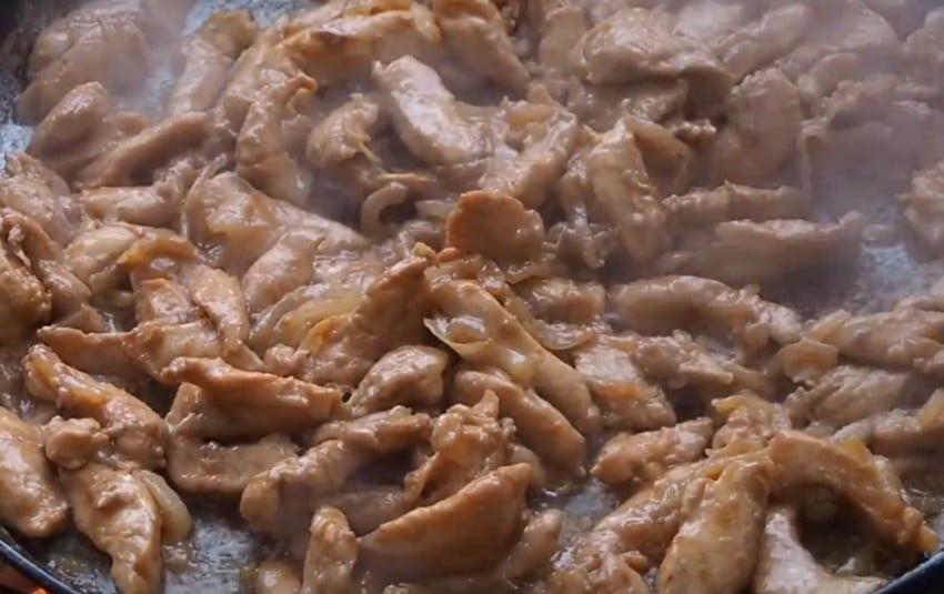 5. Выложите к луку маринованное филе. Не убавляя нагрев, постоянно помешивая, готовьте 5 минут.