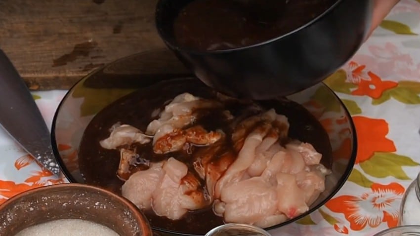 2. Сделайте маринад, превратив в однородную массу соус, сахар, паприку, имбирь, крахмал и измельченный чеснок. Разделите состав на 2 части. Одной половиной залейте курицу, перемешайте и оставьте на 30 минут настаиваться.