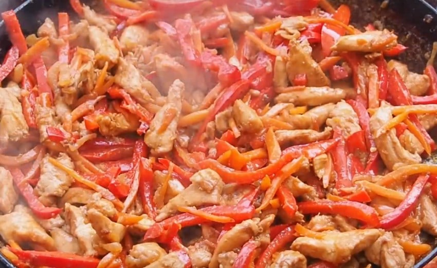 5. Обжариваем кусочки филе до лёгкого равномерного зарумянивания и кладём к нему сладкий перец. Систематически перемешивая, готовим ещё четыре минуты.