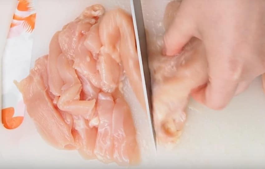 1. Прохладной водой обмываем филе. Обсушиваем курятину полотенцем и нарезаем небольшими полосками, сантиметровой толщины.