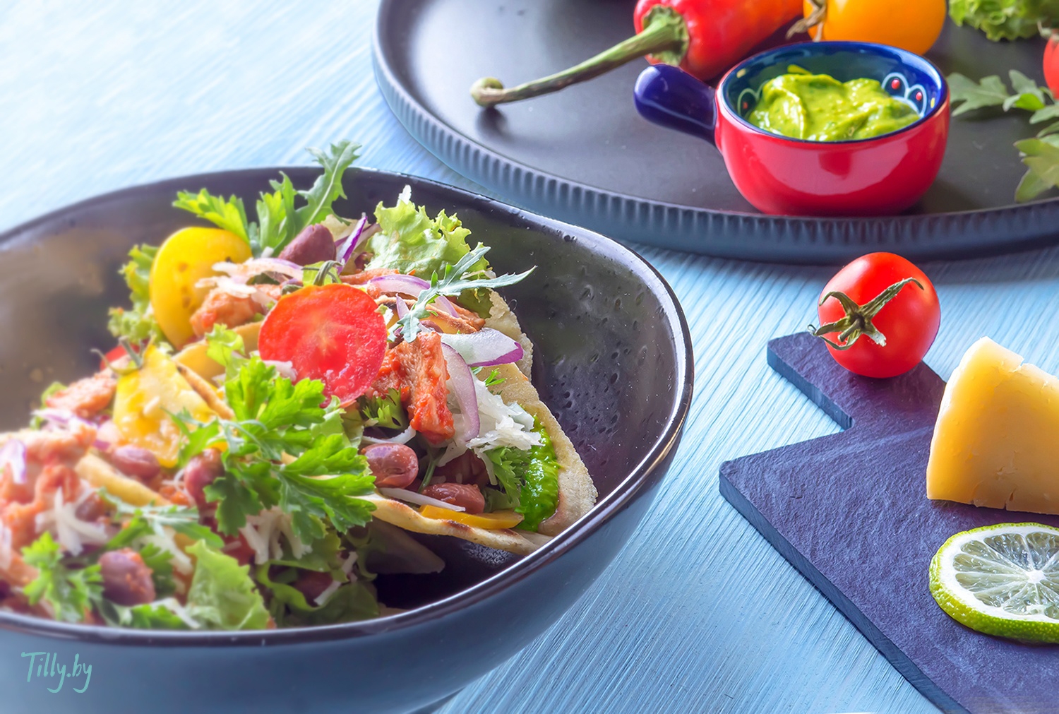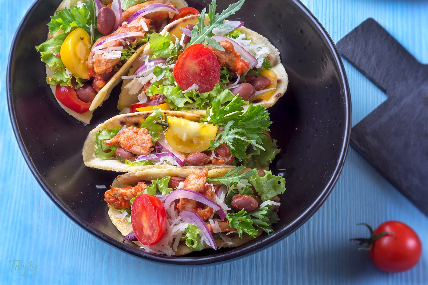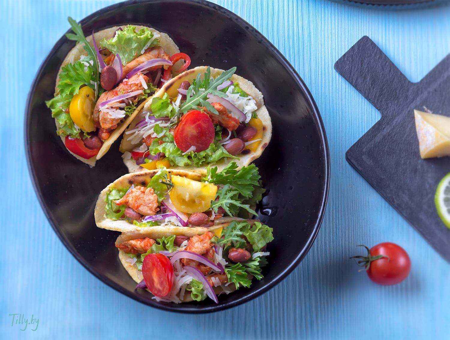 Тако, или такос, — популярная в Мексике закуска, которая представляет собой сложенную пополам пшеничную или кукурузную лепешку тортилью с сытной начинкой внутри. В ее составе обязательно должен быть какой-нибудь мясной ингредиент, много разных овощей и острые специи.